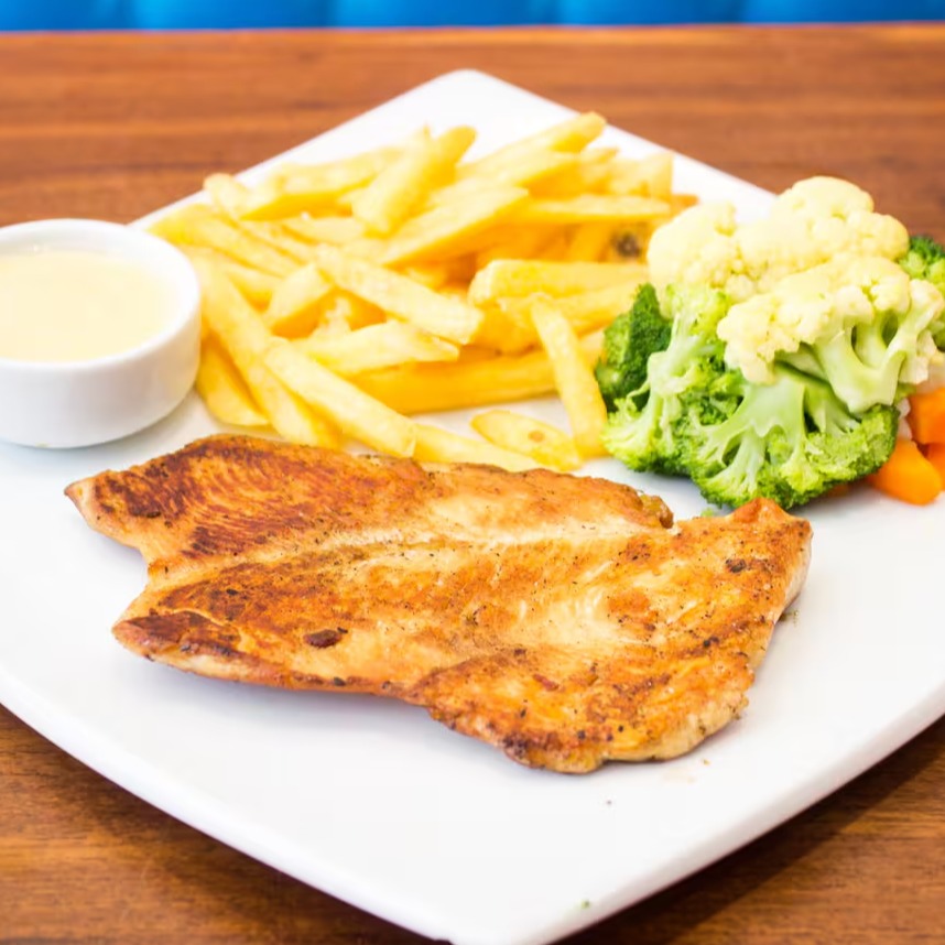 Pão na chapa generosamente recheado com Catupiry cremoso. Para acompanhar, um suco de laranja natural de 300ml e uma porção de salada de frutas de 300ml.
